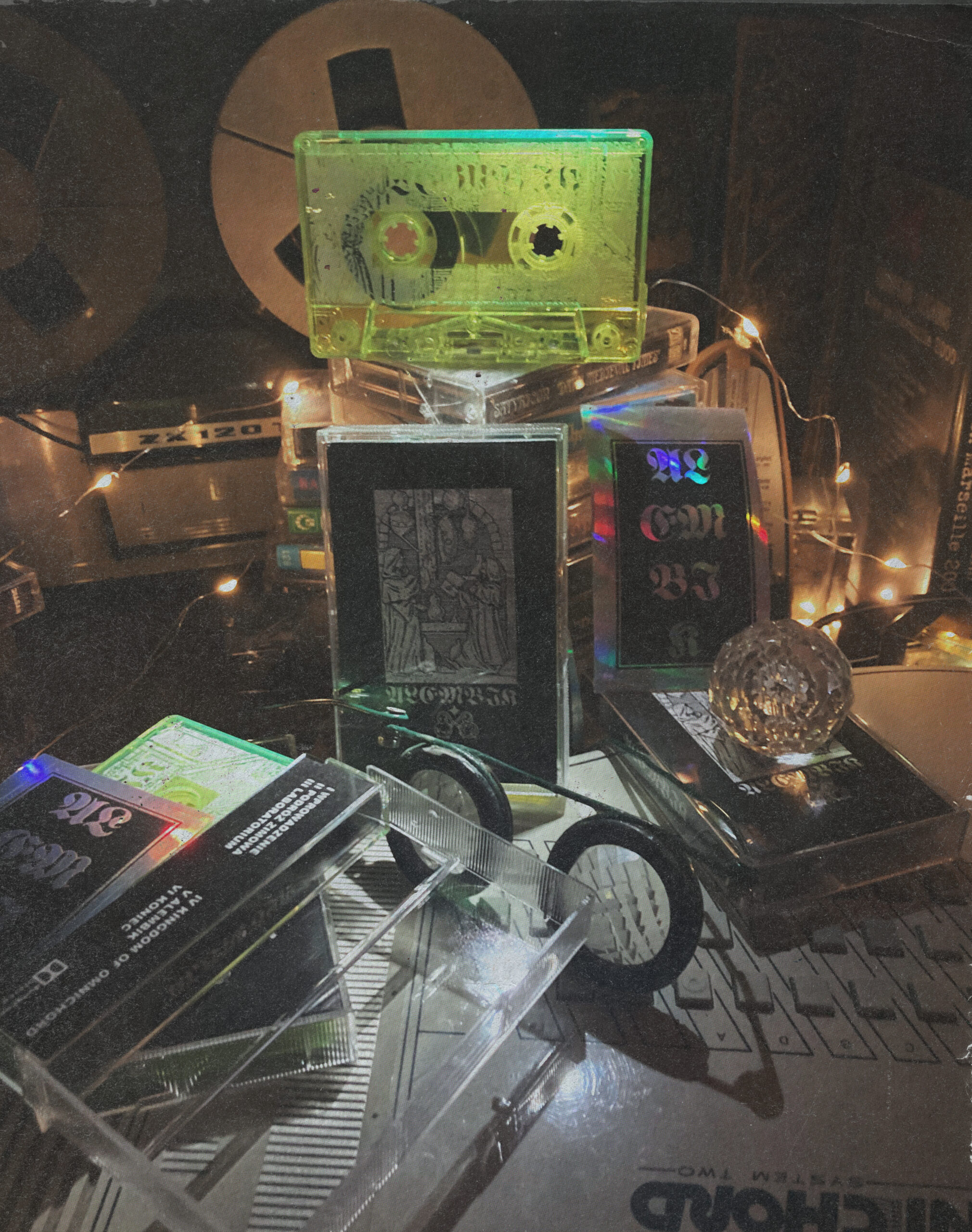 Green, transparent cassette tape. Each comes with a holographic sticker.
